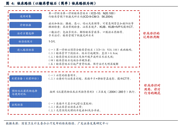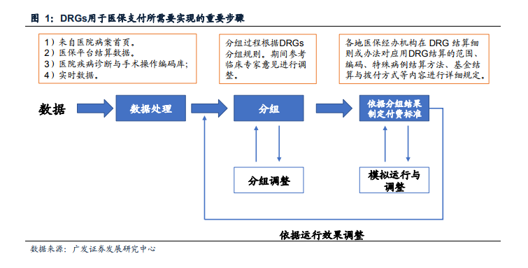 DRGS 基本原理与作用。疾病诊断相关组(Diagnosis Related Groups,DRG)是用于衡量医疗服务质量效率以及进行医保支付的一个重要工具。DRG实质上是一种病例组合分类方案,即根据年龄、疾病诊断、合并症、并发症、治疗方式、病症严重程度及转归和资源消耗等因素,将患者分入若干诊断组进行管理的体系。(资料来源:卫健委发布《国家医疗保障疾病诊断相关分组(CHS-DRG)分组与付费技术规范》)医保应用DRG付费所期望达到的目标是实现医-保-患三方共赢。通过DRG付费,医保基金不超支,使用效率更加高效,对医疗机构和医保患者的管理更加精准;医院方面诊疗行为更加规范,医疗支出得到合理补偿,医疗技术得到充分发展;患者方面享受高质量的医疗服务,减轻疾病经济负担,同时结算方式也更加便捷。