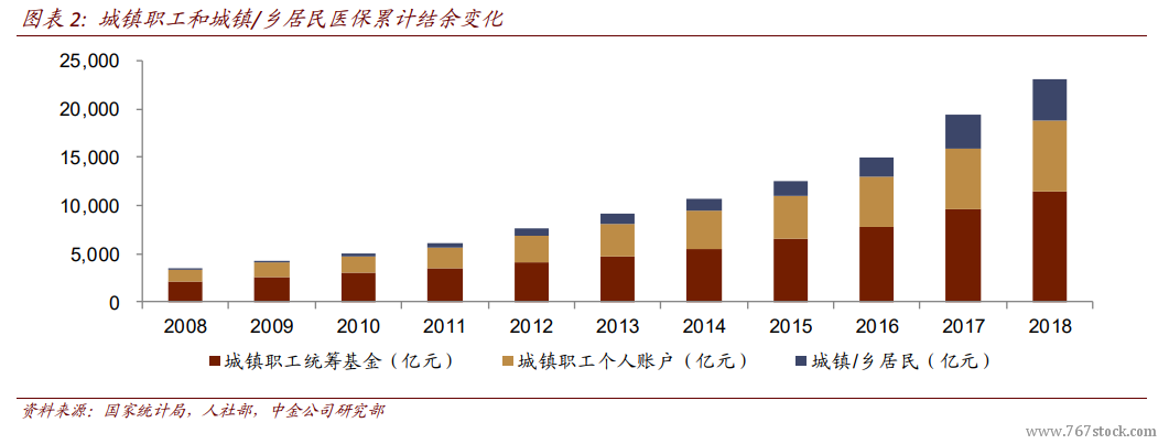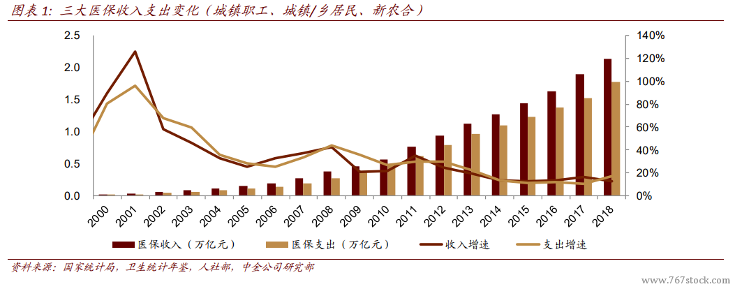 医保整体运行平稳。医保基金使用的基本原则是“以收定支、收支平衡、略有结余”。从医保基金收支增速情况看,收入和支出增速基本同步变化。从医保累计结余与当年支出的比重也保持在 1.3 以上。就城镇职工医保而言,城镇职工参保人员的结构保持稳定,在岗职工人数占比基本保持在~75%,因此我们预计城镇职工医保的运行将保持平稳。城乡居民医保的累计结余与当年支出比值近年有所降低,2018 年为 0.70,但考虑到政府财政在城乡居民医保中的重要作用,我们预计城乡居民医保的运行也将保持平稳,城乡居民医保收入中 2/3 以上来自财政补助。