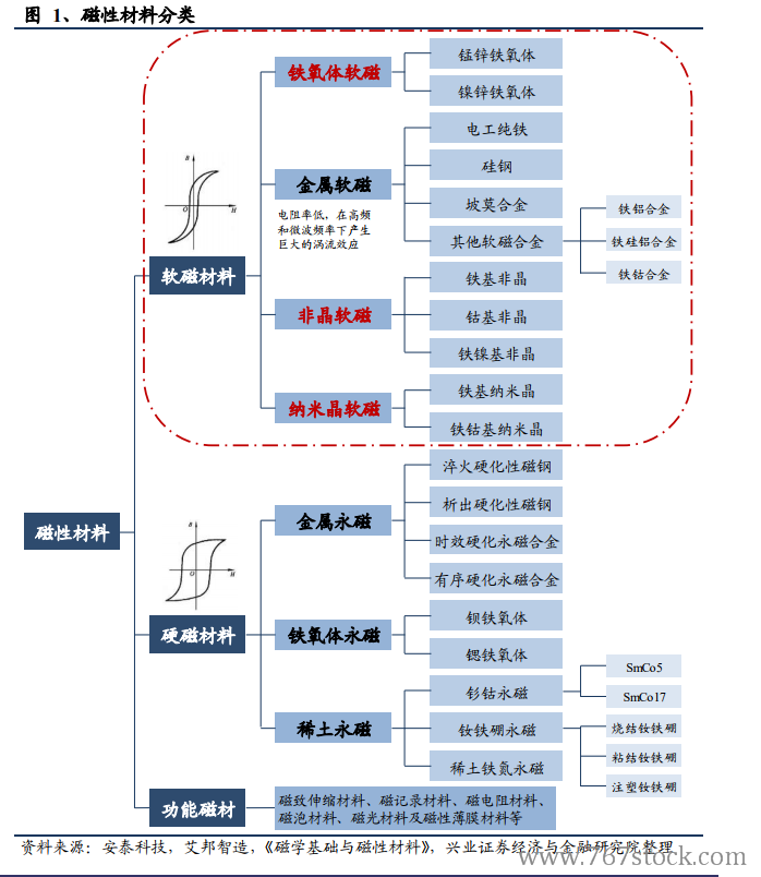 磁性材料是指具备强磁性的物质,按使用可分为软磁材料、硬磁材料和功能磁性材料。软磁材料在磁场作用下非常容易磁化,同时取消磁场后又很容易退磁化,具有较高的磁导率、较高的饱和磁感应强度、较小的矫顽力,磁滞损耗小,应用于变压器、继电器、电感铁芯、继电器和扬声器磁导体、磁屏蔽罩、电机定子转子等。而硬磁材料通常难磁化、难退磁、剩磁高、矫顽力大,主要作为磁场源用于储藏和供给磁能,应用于各种电机、仪表、设备等。