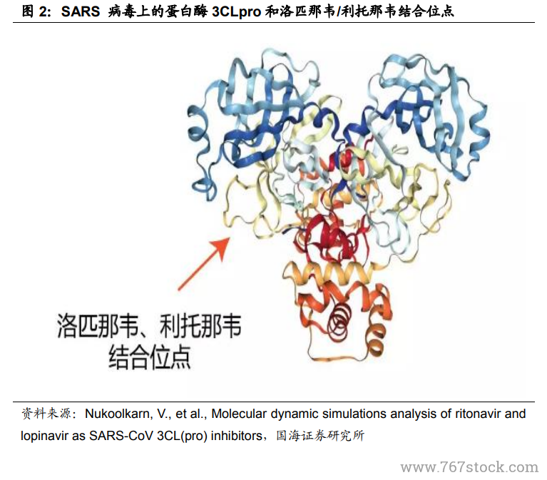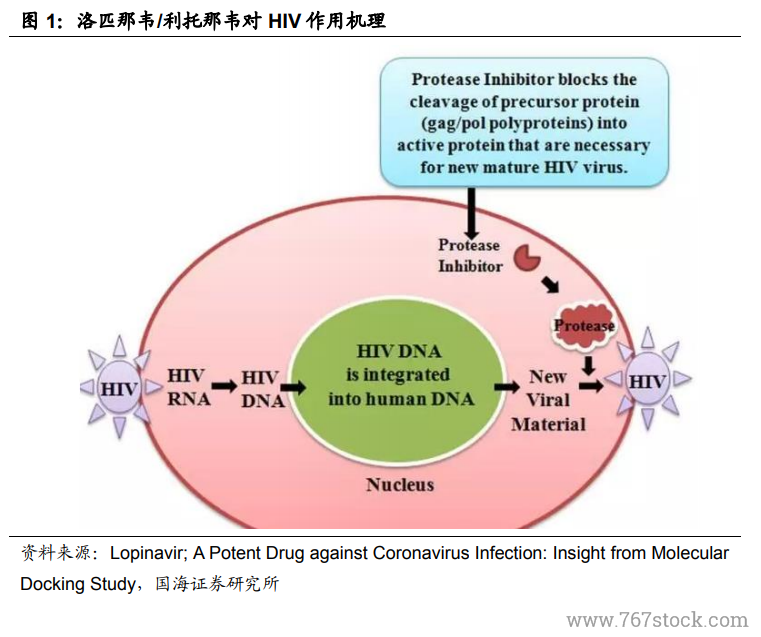 新型冠状病毒与 HIV 一样,都属于 RNA 病毒,而 RNA 是核酸链,需要有蛋白外壳才能生存,生成蛋白外壳需要利用宿主细胞,进行翻译机制制造蛋白外壳,如此病毒才能组装出自己的结构。因此从作用机理上洛匹那韦/利托那韦等针对HIV 的蛋白酶抑制剂有希望和冠状病毒蛋白酶结合从而抑制其正常功能,则可发挥抗冠状病毒作用。