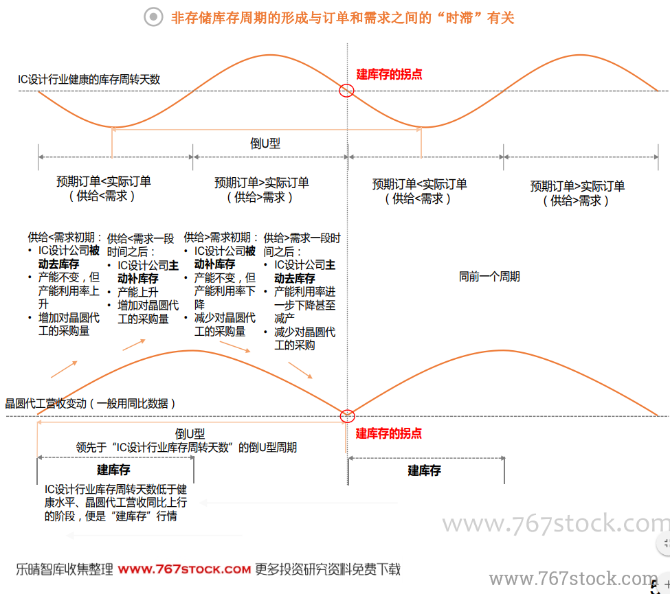 库存周期的本质:是企业供给(短周期生产函数)对经济需求的滞后响应。非存储行业中分工模式(IC设计、晶圆代工、封测的垂直分工模式)占比越来越高,我们以分工模式为例。