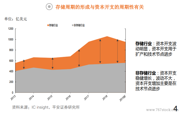 资本开支/产能周期是由于投资产能释放的滞后性导致产能的释放与当时的需求不匹配,供需关系失衡从而带来价格的波动,形成厂商营收和盈利能力的周期性波动。存储行业相比非存储行业,存在着更明显的中期周期——资本开支/产能周期。