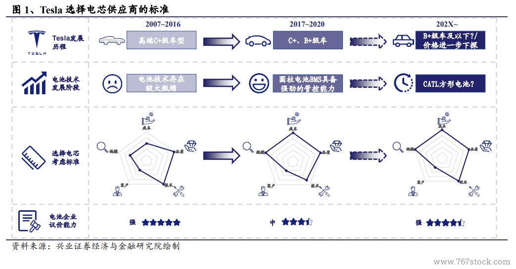 Tesla 选择电芯的标准随自身竞争力和电芯行业发展正逐渐发生转变:我们认为得益于其圆柱 BMS 对电芯极强的管理能力以及其他电芯厂商电池技术逐渐进步,当前 Tesla 选择电芯供应商的标准正由技术(指技术研发与储备)与品质优先,逐渐转向成本、品质、规模优先,保障安全性及保规模化供应的同时,进一步降低成本,带动整车销量。