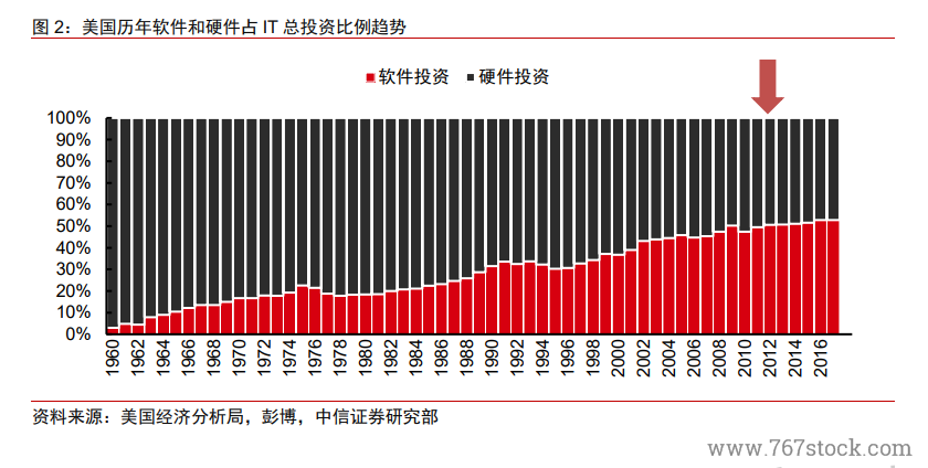 云计算年代促进软件投资激增。我们认为中美在产品结构、增长逻辑上存在较大的差异。经过 PC、互联网和移动互联网年代,软件的重要性慢慢在提高。到了云计算年代,部分企业的硬件支出变成了给云供应商的软件订阅费用,因此促进了软件投资在 2010 年后的大幅上涨。2012 年以后企业部门在软件领域的支出已经超过硬件,为美国 IT 和软件市场定下扎实的基础。