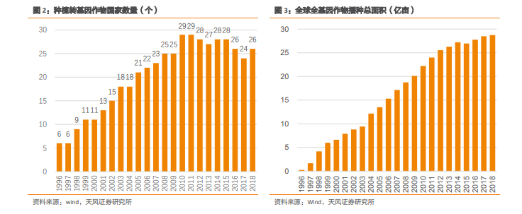 随着转基因种子技术的逐渐成熟,转基因种子的应用也开始在全球推广。1996 年以后,全球种植转基因作物的国家数量快速增长,1996 年仅有 6 个,而 2018 年已然发展至 26个。同时,转基因作物播种面积快速增加,2018 年全球转基因作物播种面积达到 28.76 亿亩。