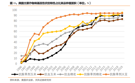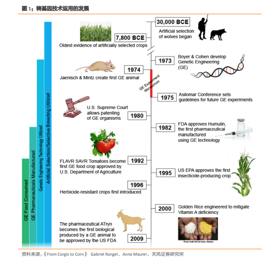 科研突破为转基因种子的商业化使用奠定基础。第一个转基因事件是 1987 年进入审批流程的西红柿。经过 5 年的安全、环境测试,这个改变了基因序列而提高了自身硬度和保质期的西红柿成为了美国第一个商业化的品种。1995 年,第一例自主产生杀虫剂的转基因作物种子被美国环境保护机构批准;1995 至 1996 年,抗虫抗除草剂的转基因玉米获得种植许可。