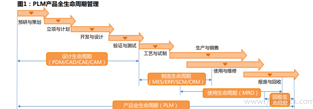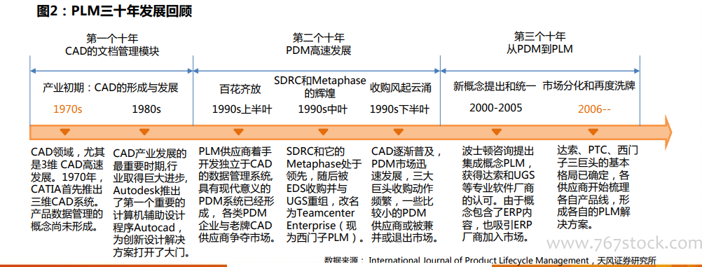 PLM:生产数据规模化的产物,CAD/PDM概念的延伸。PDM/PLM概念的应用与发展与CAD息息相关:CAD的大量应用,使企业认识到了与产品数据管理的重要性,从而推进工业数字化、工业4.0和PLM行业的重大变革,加速供应商在解决方案中融入新兴技术的趋势。PLM完全包含了PDM技术(产品数据管理),是其功能的延伸:PDM主要针对产品开发过程,强调对工程数据的管理,而PLM在其内容基础上又强调了对产品生命周期内跨越供应链的所有信息进行管理和利用,从而使特定产品生命周期过程的内外部涉众之间可以更加密切协作,更好地适应市场需求。