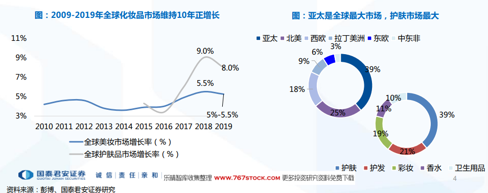全球化妆品市场维持稳健增长,亚太是最大市场。2019年全球化妆品市场规模超过2200亿欧元,行业增速5%-5.5%,继2018年创下近二十年新高后延续了快速增长。2019年全球美妆市场中护肤、洗护发、彩妆为前三大品类,收入占比分别为40%、21%、18%,亚太市场以39%的市场占有率成为全球最大市场。