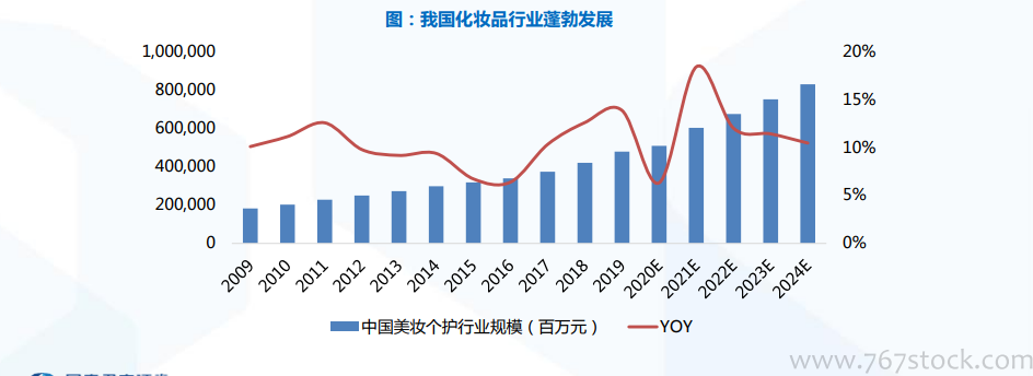 行业空间:国内化妆品市场达4777亿元,维持双位数增长。国内化妆品行业蓬勃发展,市场规模突破4777亿元。2009年-2019年,化妆品行业复合增速达10.0%,2019年市场规模突破4777亿元,增速进一步提升至13.8%。根据欧睿咨询预测,2020年-2024年,我国化妆品行业仍将维持13%的复合增长。