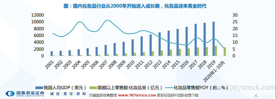 化妆品限额以上零售额近10年复合增速15%。化妆品行业自2000年起进入快速成长期,2019年化妆品限额以上零售额达2992亿元,近十年复合增速达15%,2020年1-10月在疫情冲击下依然实现了5.9%的正增长。2019年中国人均GDP为70892元,按日前最新汇率折算为10535美元,略高于日本1982年的发展水平,参考日本经验,随着我国经济持续增长和居民消费水平提升,化妆品消费有望迎来黄金时代。