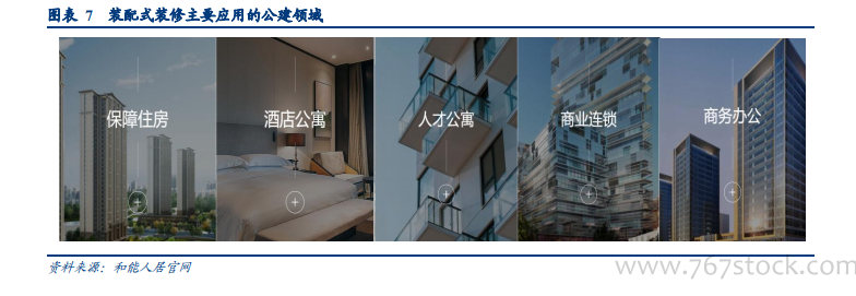 装配式装修目前主要应用于保障房、长租公寓、酒店、办公楼等公建领域,该类需求与住宅领域需求存在几个明显的差异:1)更加标准化,不强调个性化需求;2)对工期要求较高,尤其是长租公寓、酒店等运营类的项目,节省的工期能够增加企业的运营收入;3)后续的更新或维修频率更加频繁。装配式装修的优势能够与公建领域的需求完美适配,以 50 平的保障房为例,装配式装修的现场工期较传统装修减少 80%,用工量减少 60%,地面、隔墙及整体的材料减轻 60%~70%。