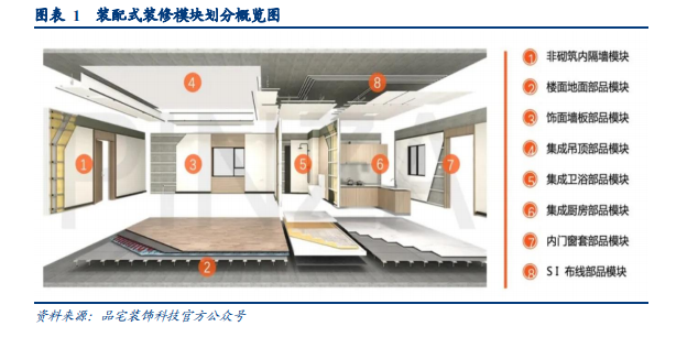 什么是装配式装修?装配式装修是装配式建筑的内装部分,根据住建部,装配式装修是指一种“采用干式工法、将工厂生产的内装部品在现场进行组合安装的装修方式”,按模块来划分,大致可以分为墙面系统、地面系统、吊顶系统、整体卫浴、集成厨房、水电系统及其他等几大模块。