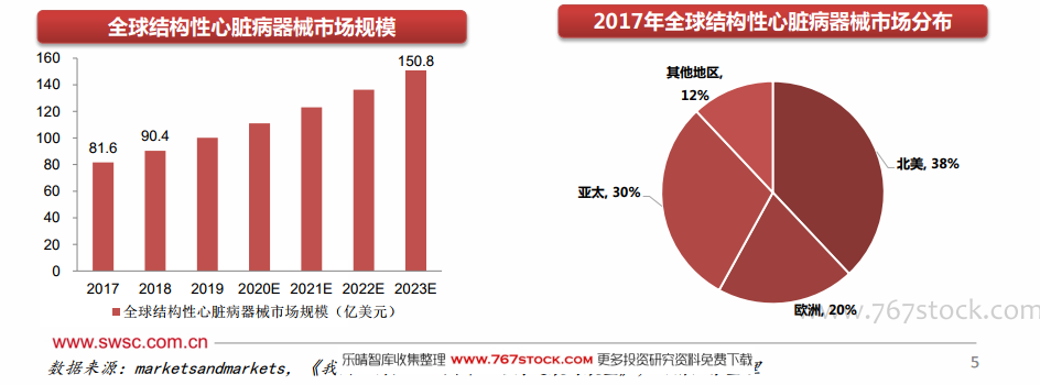 全球看:结构性心脏病器械有望持续增长。结构性心脏病(Structural heart disease,SHD)泛指一大类先天性或获得性的以心脏和大血管结构异常为主要表现的心脏疾病,如传统定义的先天性心脏病、心脏瓣膜病和心肌病等。从全球市场来看,结构性心脏病是近十余年心血管疾病领域一个新型的亚专业。伴随着介入手术的发展,结构性心脏病器械逐渐成为一个高增长、大体量、高价值的成长行业,预计2023年全球结构性心脏病植介入器械行业规模有望达到150.8亿美元,2017~2023复合增速10.8%。结构性心脏病介入器械主要包括经皮瓣膜修复与置换和介入封堵术,其中TAVR产品、MitraClip、LAAC、先心病封堵器等比较成熟的领域和产品在2018年收入合计超过55亿美元,包括这些手术的配套器械(如通道产品)预计行业空间超过60亿美元,占2018年行业规模90.4亿美元的66%。从区域分布看,北美(38%)、欧洲(20%)、亚太(30%)为主要的市场,预计发达国家占比约80%。