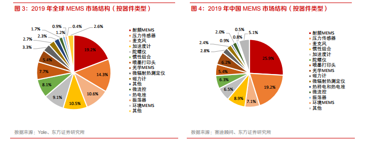 射频 MEMS、压力传感器、麦克风、加速度计、陀螺仪和惯性组合是目前应用最为广泛的器件。根据 Yole 的统计数据,全球 MEMS 产品结构中,射频 MEMS 份额 19.2%居首,其他产品中压力传感器、麦克风、加速度计份额超过 10%。中国市场结构与全球类似,根据赛迪顾问发布的数据,2019 年国内射频 MEMS 产品收入占比为 25.9%;压力传感器占 19.2%排第二位,麦克风、惯性组合、加速度计分别占比 7.1%、8.9%、6.5%。