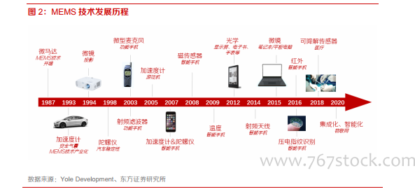 MEMS 产品日益丰富,智能化、集成化程度逐步提高。1987 年美国伯克利加州大学发明了微马达,被认为是 MEMS 技术的开端;1993 年 ADI 公司的微加速度计产品大批量应用于汽车防撞气囊,MEMS 正式走入产业化阶段。20 世纪 90 年代 MEMS 技术快速发展,围绕深槽蚀刻技术发展出多种加工工艺,微镜、喷墨打印头等 MEMS 产品不断涌现。2007 年以后,以智能手机为代表的消费电子产品大量应用 MEMS 传感器,惯性传感器、磁力计、光学 MEMS、射频 MEMS 等应运而生。近年来,物联网的发展不断推动 MEMS 技术进步,9 轴 IMU、集成环境 MEMS 等被大量应用,MEMS 集成化、智能化是未来发展趋势。