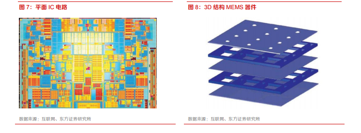 不同于 IC 的平面结构,MEMS 器件是三维机械结构,工艺偏定制化。虽然 MEMS 制造工艺采用了 IC 技术来实现,但是其本质上是与 IC 结构有着截然区别的:IC 的基本结构晶体管是一种纯粹的电学器件,在所有产品中通用;而 MEMS 是一种微机械结构,包含了微米级别的齿轮、仪表、引擎和泵,除了与 IC 采用同样的硅材料外,基本结构并不能完全做到统一和通用。因此 MEMS器件的制造工艺更为定制化,有“一种产品,一种工艺”的说法。