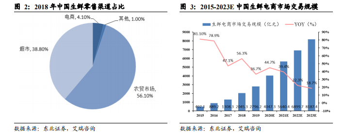 目前生鲜电商渗透率较低,但近年来增速迅猛。生鲜产业按零售渠道可划分为三类:农贸市场、商超大卖场和电商,目前农贸市场仍占据主流地位,但随着“农改超”等利好政策的推进,以及电商巨头阿里、京东等的入局,持续加码供应链物流等基础建设投资,生鲜电商模式和技术将加速成熟,生鲜电商渗透率有望快速提升。根据艾瑞咨询测算,2018 年农贸市场在我国生鲜零售渠道中占比为 56.1%,超市为38.8%。电商渠道目前仅占 4.1%,但呈迅速增长态势,2019 年生鲜电商市场交易规模达到 2796 亿元,同比增长 36.7%,2015-2019 年 CAGR 高达 54%。