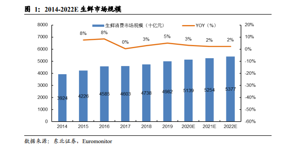 生鲜产业拥有万亿级别的市场体量,是国民基础消费品产业,近年来增长态势稳定。果蔬、肉禽蛋等生鲜品类具有高频、刚需的消费特性,目前我国生鲜食品的购买频次约为每周三次,高于全球的 2.5 次,是国民生活必需的消费品。根据 Euromonitor数据显示, 2019 年国内生鲜零售市场总额达到 5 万亿元,同比增长 5%,2014-2019年 CAGR 为 4.9%,呈稳步增长态势,预计 2022 年市场规模将达到 5.4 万亿元。