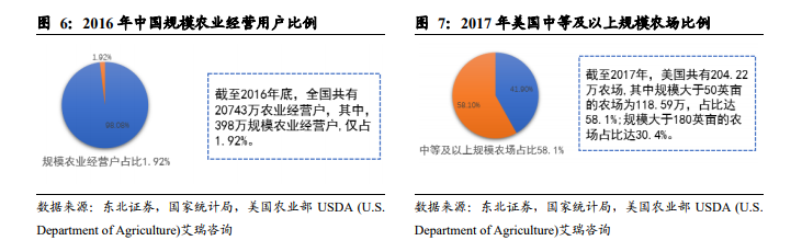 生鲜生产地域性明显,供应源头分散。受到生鲜产地分散且分布不均、机械化水平落后等原因影响,我国生鲜生产源头仍以分散的小规模经营户为主,规模化的农业生产基地占比较少,与发达国家还有一定的差距。2016 年第三次全国农业普查报告显示,全国共有 20743 万农业经营户,其中以商品化经营为主、播种面积在 100 亩及以上的规模农业经营户仅占 1.92%。2017 年美国农业部数据显示规模大于 50 英亩的农场占全部农场的比例达 58.1%,农业发达国家规模化生产程度更高。