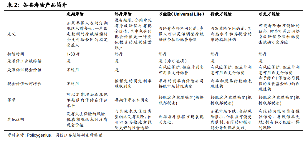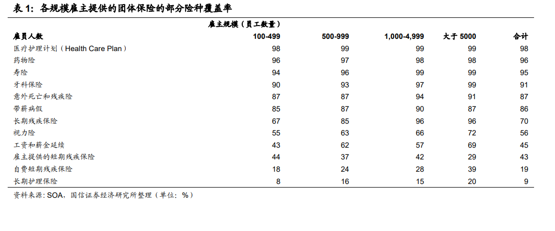 团体健康及意外保险覆盖全面,保障更加细化,降低传统保障型产品的重要性:如下表所示,美国团体保险的覆盖险种已经相当全面,使得残疾险、牙科保险及意外险等险种的保费排名同业前三,在一定程度上替代了其他保障型险种的角色。例如,残疾保险及意外险等险种与重疾险在保障功能上有较多的重合,替代了重疾险的许多功能,在一定程度上压制了重疾险的市场空间。在美国团险市场中,重疾险(Critical illness)的保费规模要小于残疾险(Disabilityinsurance);