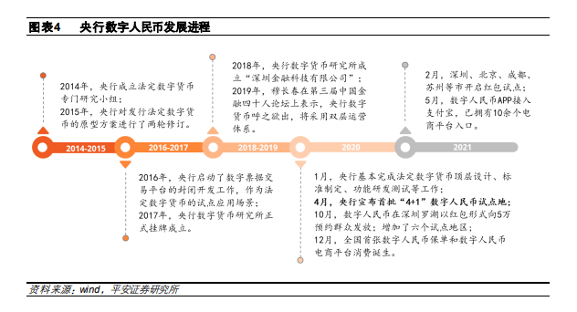 我国数字人民币的发展进程可以分为研发阶段和试点阶段。数字人民币继 2016 年被确立为战略目标后,直至 2019 年都处于稳步研发阶段。央行在 2014 年成立法定数字货币专门研究小组,2016年 1月确立了发行数字货币的战略目标。2017年 5月央行数字货币研究所正式挂牌成立,主要负责数字货币法律研究、区块链开发及芯片设计等相关工作。2018年至 2019 年上半年,央行数字货币研究所重点扩充研发力量,相继在深圳、南京、苏州成立金融科技公司和研究创新中心。2019年 8月,央行召开 2019 年下半年工作电视会议,明确指出下半年要加快推进数字人民币的研发步伐。