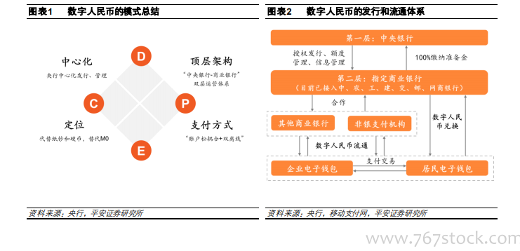 数字人民币(DCEP,Digital Currency/ Electronic Payment)是我国的央行数字货币。数字人民币属于法定货币,由央行中心化发行和管理,定位于 M0,作为现钞的数字化形式,价值、功能属性都和现钞类似。发行体系上,数字人民币采用“央行-商业银行”双层运营模式,即“二元体系”。央行负责第一层的数字人民币制作发行,按照 100%准备金兑换给第二层的商业银行。商业银行则面向群众,负责数字人民币的转移和确权,并基于用户绑定的银行账户进行兑换,用户可在数字人民币钱包(母钱包)下开立一个或多个由商业银行运营的子钱包。目前支持数字人民币钱包的运营机构有 7 家,包括工商银行、农业银行、中国银行、建设银行、交通银行、邮储银行以及网商银行(支付宝)。