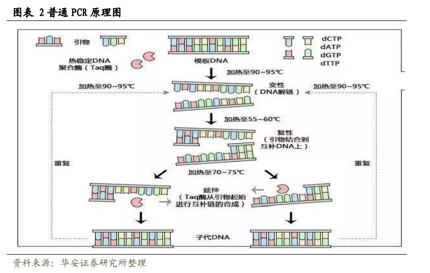 PCR(聚合酶链式反应)是一种用于放大扩增特定 DNA 片段的分子生物学技术,可以看作是生物体外的特殊 DNA 复制,其最大特点是能将微量的 DNA 大幅增加。在存在DNA 模板、引物、dNTPs、适当缓冲液 (Mg2+) 的反应混合物中,在热稳定 DNA 聚合酶的催化下,对一对寡核苷酸引物所界定的核酸片段进行扩增,这种扩增是以模板 DNA与引物之间的变性、退火、延伸三步反应为一个周期,循环进行,使目标 DNA 片段得以扩增。