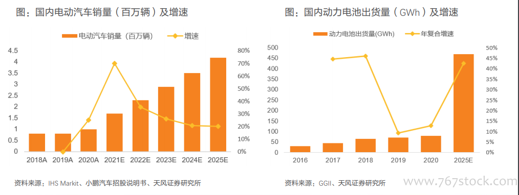 国内新能源汽车的销量于2021年迎来快速增长,未来一段时期增速稳定。根据IHS Markit报告,中国电动汽车销量从2021年开始进入快速增长期,增速稳定。预期将从2020年的约1.0百万辆增加至2025年的4.2百万辆,将超过美国及欧洲电动汽车销量的总和。