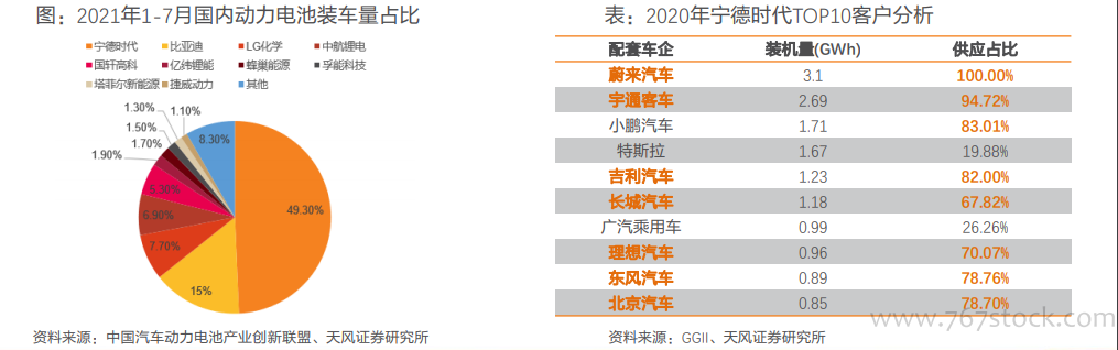 动力电池市场份额集中度较高,叠加动力电池供不应求处于卖方市场,目前电池供应商的话语权较大,削弱了主机厂对产业链的把控能力。根据中国汽车动力电池产业联盟发布的数据,2021年1-7月,国内动力电池装机量CR3达到72%,龙头企业宁德时代占比接近50%。 而2020年宁德时代对吉利、长城、蔚来、小鹏、理想等车企的供应占比都超过了60%。头部电池供应商在产业链中的话语权较大,影响了主机厂对电池供应稳定性的要求。