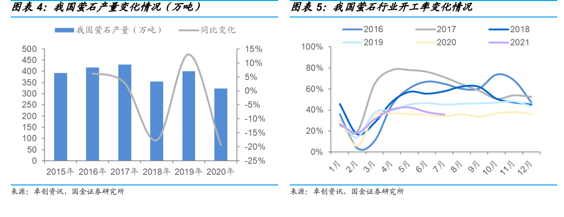 矿山安全治理及环保治理对不达标企业进行关闭,行业有效供给逐步下行。伴随矿山安全、环保治理的展开,小规模生产不达标萤石企业有望逐步进行关闭,淘汰落后产能,新建规模化矿上开采企业,逐步改善萤石行业的竞争环境。根据卓创咨询统计,2021 年,我国前 7 个月萤石合计产量约为193 万吨,虽环比提升,但仍较疫情前 2019 年同期数据下行约 8%,萤石持续供给低位,带动行业库存保持较低水平,为产品价格维持高位提供了良好的基础。