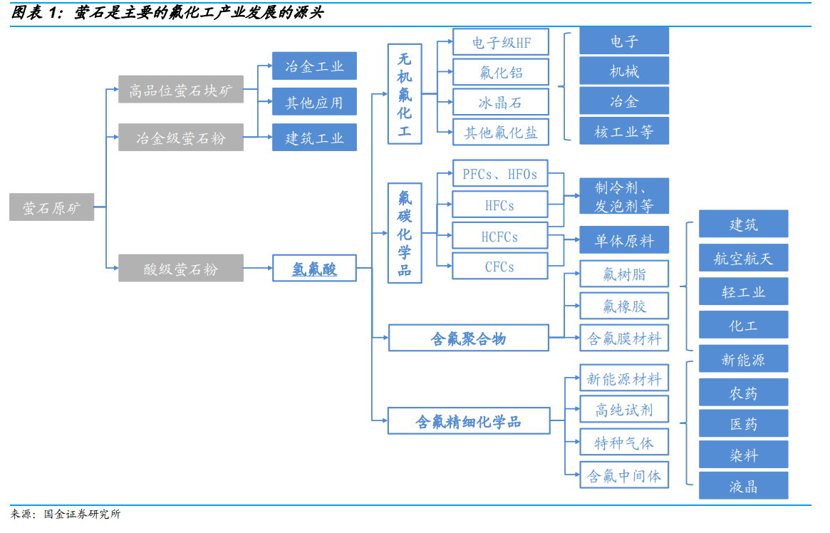 萤石是氟化工产业链发展的主要源头。氟(F)作为最小的卤族元素,原子半径较小,同碳结合后具有极良好的稳定性和生理活性,可以广泛应用于制冷剂、发泡剂等领域,同时其脂溶性、疏水性等良好特性使得含氟精细化工品在农药、医药、染料等多个领域应用极为广泛。
