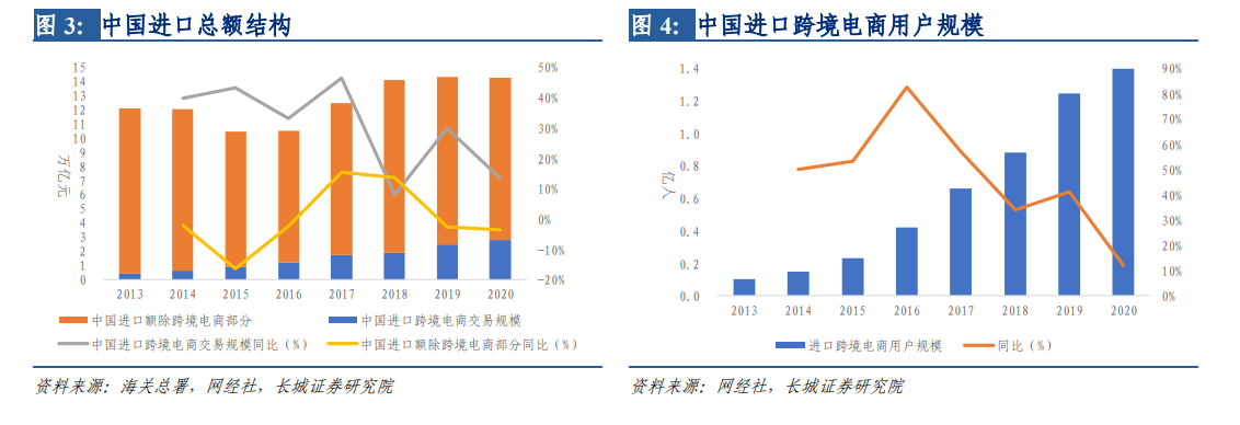电商渠道增速强劲,在跨境行业重要性日渐提升。跨境电商行业凭借较强的成长性,逐步成为我国进出口贸易支柱产业。在我国消费者对进口商品庞大的需求叠加我国生产端对比海外的明显优势作用下,我国进出口额持续增长,2020 年达到 32.16 万亿元的规模,2015-2020 年五年复合增长率为 5.55%。在进出口金额中,跨境电商占比逐年提升,从 2015 年的 22.11%提升至 2020 年的 38.87%,在我国进出口贸易的支柱地位明确,2020年实现 12.50 万亿元,2015-2020 年五年复合增长率高达 18.16%,对进出口总额成长具备重要支撑作用。今年 5 月,亚马逊对全体卖家发出公开信,强调对入驻店铺滥用评论功能的行为的整治,卖家或因功能使用不当而被封店。随着平台集中治理范围陆续扩大,目前已累计波及中国近 5 万商家账号。目前封店风波负面影响基本落地,市场或进入反弹趋势,叠加 10 月 6 日杨洁篪与沙利文会晤释放中美关系缓和信号,跨境电商行业增长或得到进一步催化。