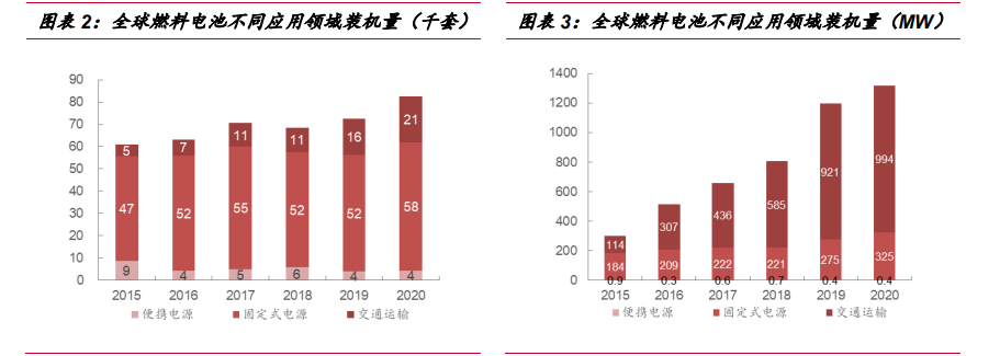 燃料电池在交通领域成长性最强。从全球来看,燃料电池主要运用于固定式电源、交通运输和便携式电源三大类领域。既适用于集中发电,建造大中型电站和区域性分散电站,也可用作各种规格的分散电源。交通运输领域包括为乘用车、巴士/客车、叉车以及其他以燃料电池作为动力的车辆,目前来看,随着国家氢能产业的推进和技术的成熟,交通领域应用的商业化进程正在加速,且交通运输领域成长性最强。据E4Tech 数据,2020 年全球交通运输用燃料电池出货量为 994MW,近五年 CAGR达 34.1%,其占全球燃料电池出货量的比例从 2015 年的 38.2%提升至 2020 年的75.4%,燃料电池在交通运输领域的应用保持高速增长。