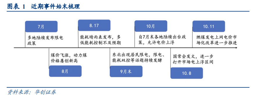 电力供需频频失衡。7 月份各地陆续出台限电政策,通过限产、错峰用电等一系列措施缓解电力供需偏紧现象。随后 8 月份动力煤价格飞涨,火电企业亏损面不断扩大,电力供应继续承压。8 月 17 日,能耗控制晴雨表发布,多地控制不及预期,各产业“限产”情况持续加剧。9 月末,东北地区限制居民用电问题频出,将市场上“限电”、“能耗双控”话题的讨论推至高潮。