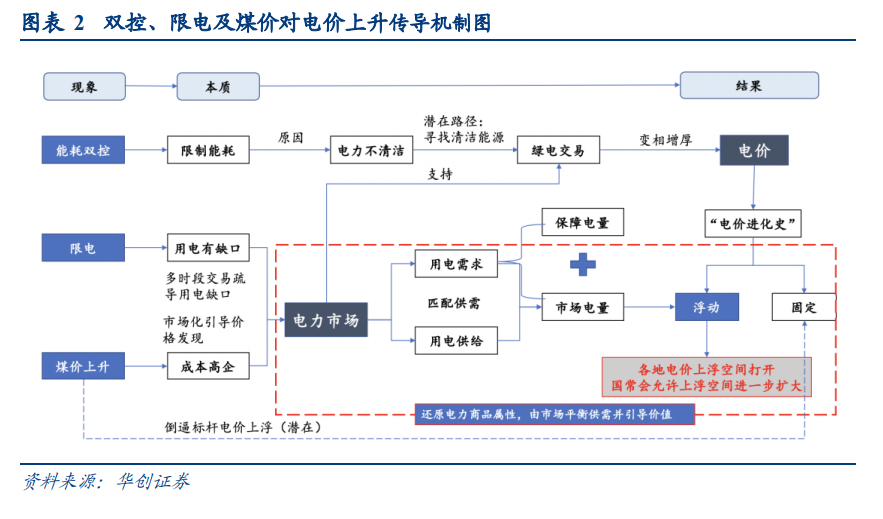 “双控政策”、“限电”和“煤价高企”共同推进了电价的市场化改革进程。“双控政策”本质是碳中和承诺下的能耗限制,“限电”本质是煤价高企导致的用电缺口叠加局部电力疏导不畅;“煤价”上升主要受产能等一系列内外供需问题的影响。这一系列市场异象导致我国电力市场的供需失衡频发,进而通过电力市场这一“枢纽”共同推动了电价上浮空间的打开。电力市场在整个电力体系中有着极为重要的作用:电力市场可以通过多时段交易疏导电力缺口从而缓解“限电”情况;与此同时“能耗双控”本质是电力不清洁才导致的控制,而清洁的绿电不受双控的限制,绿电交易市场通过交易价格更高的绿色电力变相推高了电价;电力市场也可以通过市场化交易机制疏导煤价上涨导致的发电成本高企的问题。因此,我们认为电力市场在上述传导机制中扮演了重要的“枢纽”作用,市场上的各种“异象”导致的用电供需错配问题经由电力市场得以缓解,最终共同推动了浮动电价上浮空间的打开和电力市场化改革进程的加快。