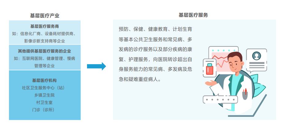 基层医疗服务:主要指预防、保健、健康教育、计划生育等基本公共卫生服务和常见病、多发病的诊疗服务以及部分疾病的康复、护理服务,向医院转诊超出自身服务能力的常见病、多发病及危急和疑难重症病人的服务。