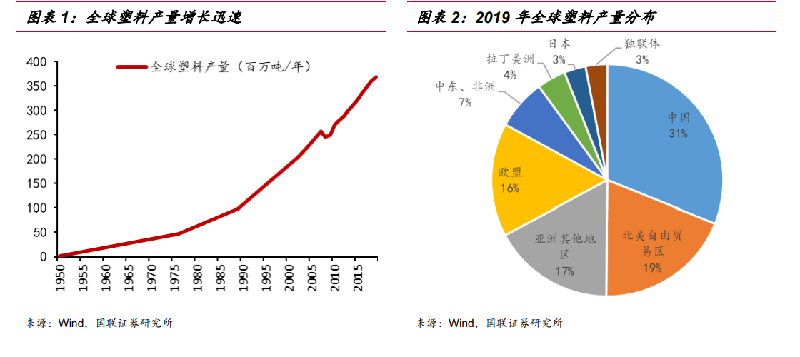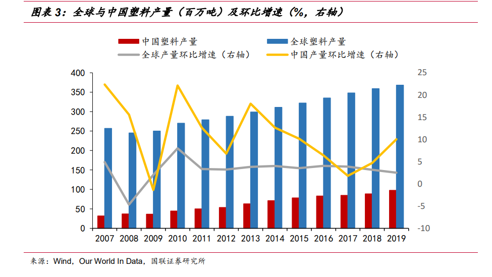 塑料产量的增长来自于对其他材料如金属、木材、纸张等的替代,根本原因是其优异的性能及基于新工艺不断降低的成本。2011 年起全球塑料制造增速呈现稳中有降,近 5 年平均增速在 3.4%左右,而国内的塑料产量虽然从趋势上也呈现增速下降的规律,但增速总体显著高于全球平均水平,近 5 年平均增速在 6.6%左右,接近全球增速的 2 倍。