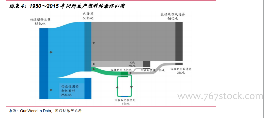 塑料诞生 150 多年来,理论上第一批塑料制品还需要至少额外 150 年才能完全降解。在 1950~2015 这 65 年内,全球已经累计制造了约 83 亿吨的塑料,若堆在平地上将构成一座 5680 米高的山峰,除了仍在最初使用状态的 25 亿吨之外,其余58 亿吨已经进入废弃或循环使用:49 亿吨被填埋或遗弃,8 亿吨被焚烧,仅 1 亿吨被回收利用后仍处于使用状态(3 亿吨被回收利用后再次遗弃),从比例来看,其实绝大部分使用完后的塑料都被遗弃/填埋(84.5%)与焚烧(13.8%)了。若加上2016-2019 的产量及对 2020-2021 的产量估算,至今总产量已超过 100 亿吨,其中遗弃与填埋的总量约 62 亿吨。
