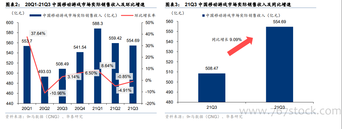 单季度来看,21Q3 中国移动游戏市场实际销售收入 554.69 亿元,环比微降但同比增长,长线游戏继续表现出较强生命力。根据伽马数据《2021 年 7-9 月移动游戏报告》显示,21Q3中国移动游戏市场实际销售收入同比增长 9.09%至 554.69 亿元,但环比下滑 0.85%。单月来看,21 年 9 月中国移动游戏市场规模达 180.30 亿,同增 12.72%,环降 6.28%。