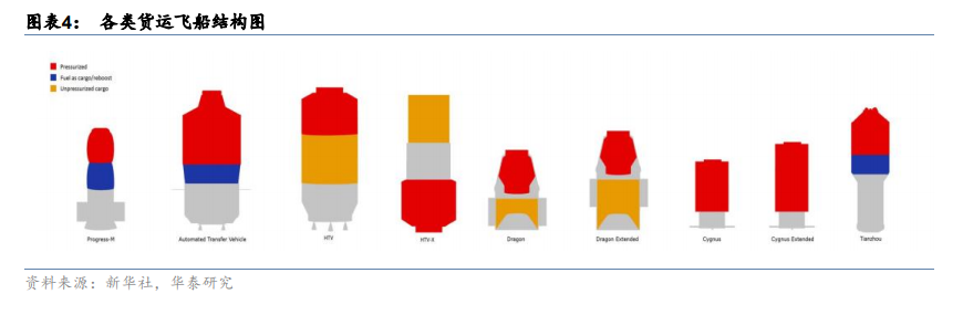 无人运载器主要形态为货运飞船。货运飞船是向地球大气层以外的宇宙空间运送货物的航天运载器,它拥有较大的货舱体积,主要用途是向地外空间定期补给食品、燃料、仪器设备等物资,协助提升空间站轨道等。目前在役的无人运载器有俄罗斯“进步号 MS”、中国“天舟”、美国“龙飞船”、美国“天鹅号”。