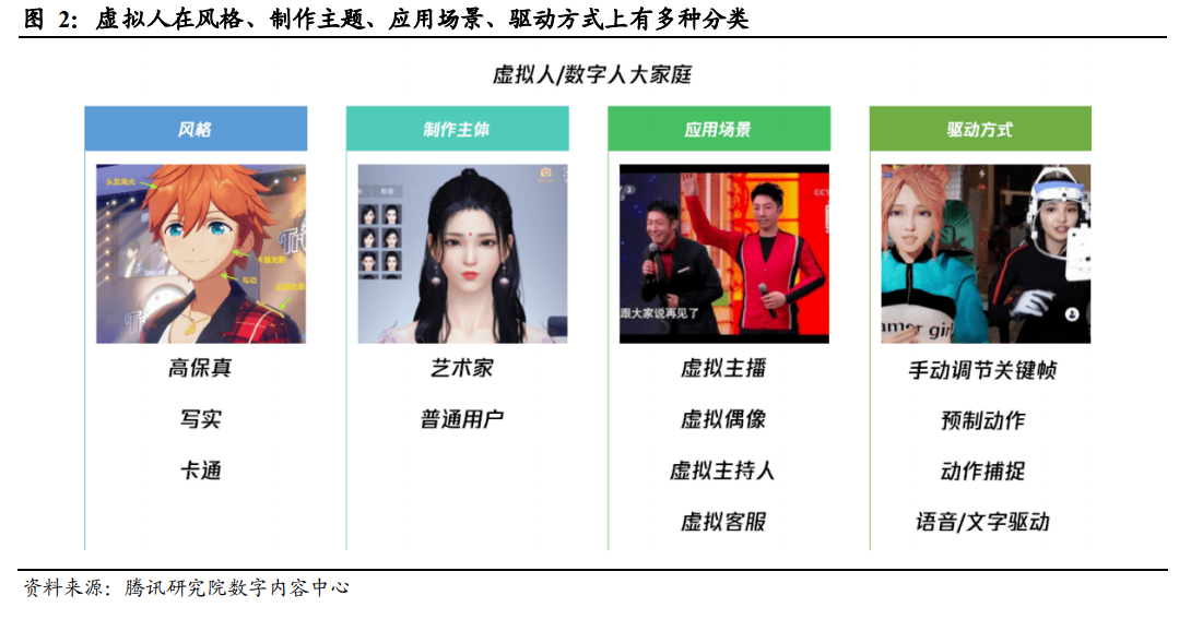 如果将元宇宙比作驶向未来的飞船,那么虚拟人是必要的船票。对于用户而言,虚拟人是任何人进入虚拟世界的必要化身,用户可以根据其喜好设置多个形象迥异的分身;对于经纪公司与 MCN 而言,虚拟偶像比真人违约风险低、公关风险低、管控力更强,因此其有意愿孵化虚拟偶像、虚拟主播;对于服务型企业而言,虚拟主持人、虚拟客服在普通 AI产品的基础上增强了互动体验并有利于塑造品牌形象。因此我们认为,虚拟人在虚拟世界和真实世界中均扮演着重要角色,科幻小说《雪崩》亦将 Metaverse(元宇宙)、Avatar(虚拟化身)两个概念紧密关联。除了从制作主体与应用场景出发以外,虚拟人还可根据美术风格的不同划分为高保真、写实、卡通三类,根据驱动方式的不同划分为手动调节关键帧、预制动作、动作捕捉、语音/文字驱动四类。
