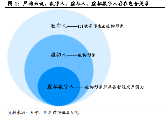 一般而言,虚拟人指由 CG 技术构建、以代码形式运行的拟人化形象。笼统地说,虚拟人、数字人、虚拟数字人均指通过 CG 技术创造出的拟人化形象,他们被赋予鲜明的人物设定,以代码与数据的形式在计算设备上运行。严格来说,虚拟人强调其在外观上与真人的相似性;数字人强调其存在于二进制的数字世界中,既可以是根据真人生成的 1:1 数字孪生,亦可以是完全虚构的形象与身份;虚拟数字人则有着更为严格的定义,根据人工智能产业发展联盟发布的《2020 年虚拟数字人发展白皮书》,虚拟数字人具备三大特征:1)拥有人的外观及性格特征;2)拥有通过语言、表情或肢体动作表达的能力;3)拥有识别外界环境、与人交流互动的能力。本文将虚拟人、数字人、虚拟数字人三个概念统称为“虚拟人”。