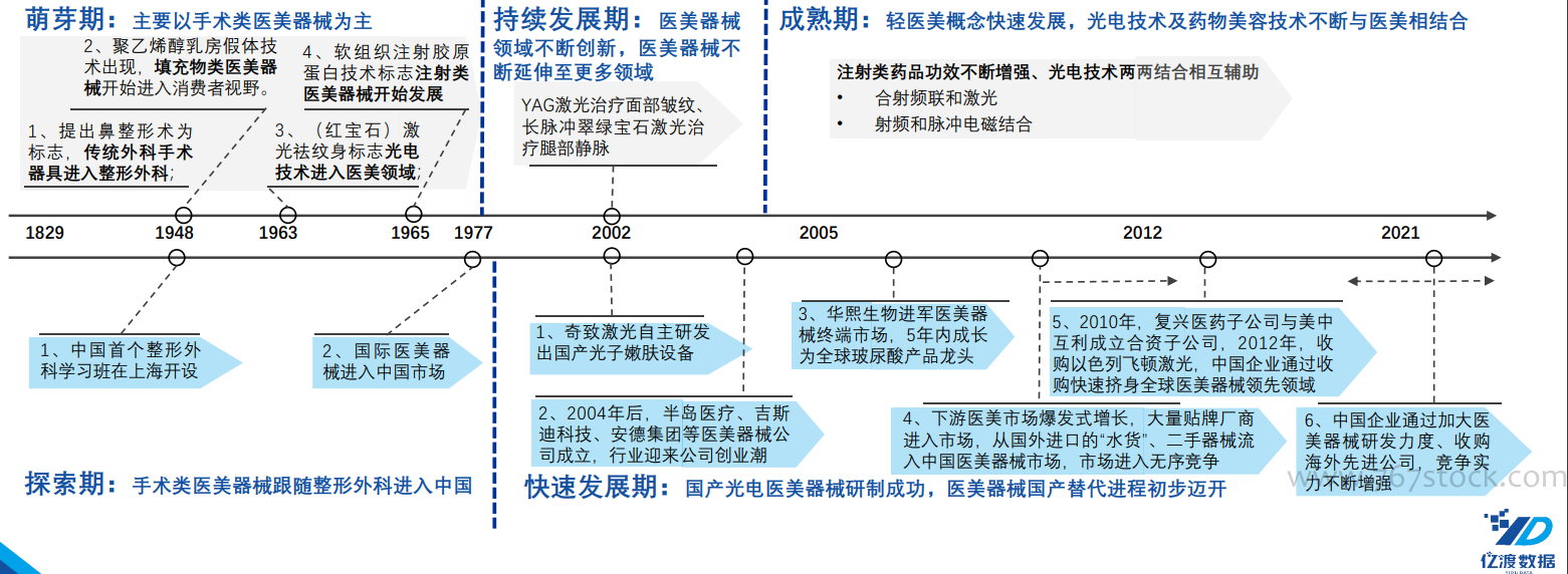医美器械行业为技术驱动发展型行业,2002-2012年,伴随中国医美器械行业公司的技术突破,中国企业在注射类医美器械、假体填充物领域取得突破并迅速占据全球市场,但在光电医美器械领域的竞争力较弱。2010-2015年,全球医美器械行业企业通过兼收并购进入整合期,但本轮整合期中国企业参与度不足,导致光电类等技术含量较高的医美器械领域全球市场集中度不断提高,海外领先企业竞争优势愈发明显。2020年前后,面对爆发式增长的医美市场,中国医美器械企业加大研发力度,产品实力不断提升,华东医药、昊海生物等大型医疗器械、医药企业收购海外领先医美器械公司,中国医美器械公司的技术实力和市场份额不断提高。