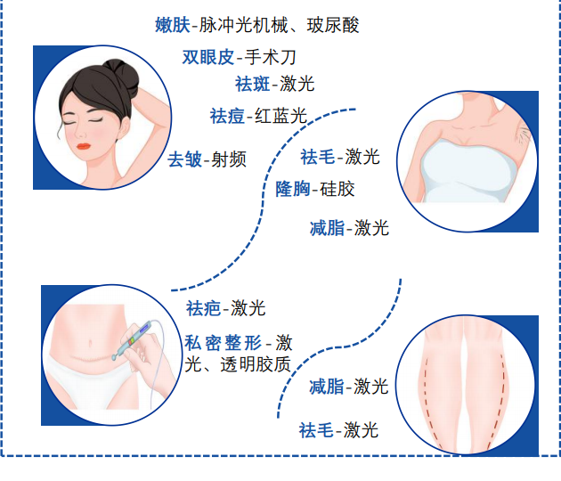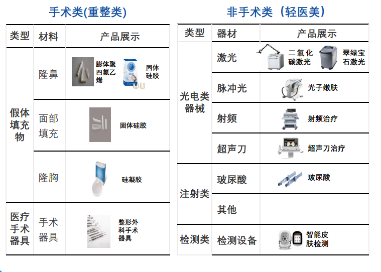 按照医美项目类型分类可分为手术类(重整形)器具、材料和非手术类(轻医美)设备、材料。其中手术类医美项目主要指整形手术,所用器械为常规类整形外科手术器具,非手术类项目包括注射类和声光电项目。