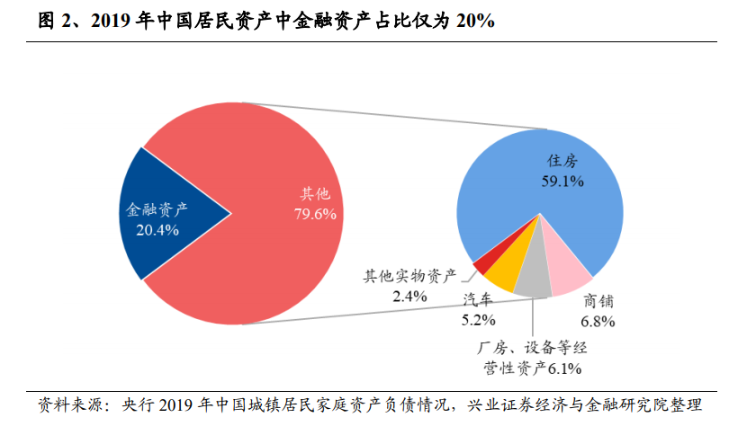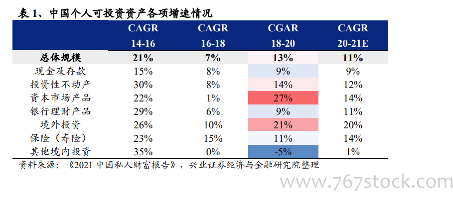 需求端:居民财富稳步增长,财富管理需求不断扩大。随着居民财富可支配收入逐步提高,富裕人群数量及资产规模迅速增长,带来居民可投资资产的持续扩容,极大地推动了居民财富管理需求的持续增长。根据招行&贝恩《2021 中国私人财富报告》统计数据,截至 2020 年,中国个人可投资资产规模已达到 241 万亿元,2018-2020 年年均复合增长率达 13%,其中,资本市场产品即个人持有的股票、公募基金、新三板和债券,规模增速尤为显著,2018-2020 年年均复合增长率达 27%。在基数创下历史新高的前提下,预计未来依然能够保持近 15%的增速。但从结构上看,我国居民的金融资产占比明显偏低,据央行 2019 年中国城镇居民家庭资产负债情况统计数据,中国居民金融资产占比仅为 20.4%,且其中约 40%为银行存款,对标世界发达经济体(美国:70%,日本:62%)仍存在显著提升空间。