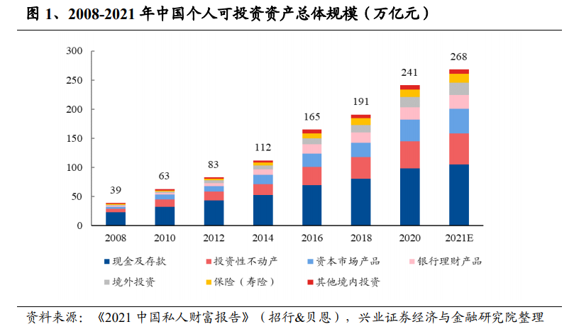 供给端:“房住不炒+资管新规+资本市场改革”的政策组合拳落地,权益市场持续扩容,多层次资管良性竞争格局逐渐形成。监管层自上而下推动金融供给侧改革,“房住不炒”等房地产调控政策促使房地产市场逐渐趋于平稳,住房资产增值空间受限,推动居民资产配置逐渐向金融资产倾斜;资管新规打破刚兑,推动资管产品加速净值化转型、去通道、去嵌套,提升主动管理能力,银行理财、券商资管、信托产品等均积极推进结构优化、转型升级;此外,资本市场改革持续深化,科创板/创业板注册制陆续登上历史舞台,为权益市场带来丰富良好标的。当前包括银行理财、公募基金、券商资管、保险资管及信托等多层次全方位的大资管良性竞争格局已然形成,为财富管理积淀了丰富的底层资产。在供需两端的共同推动下,中国财富管理市场步入黄金发展期。