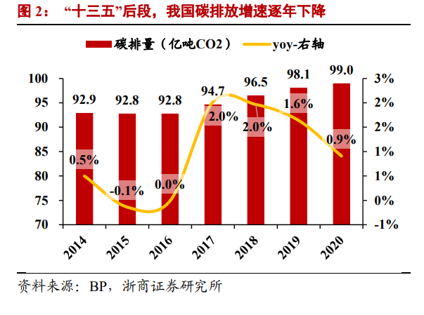 我国当前碳排放进程处高位缓增阶段,煤炭占一次能源消费比重过半。总量方面,当前我国总碳排放量为99亿吨CO2,仍处增长区间,但“十三五”后端增速显著下降;能源结构方面,煤炭占一次能源消费比重56.8%,非化石能源占比15.7%。从发达国家经验来看,控制能源消费总量、优化消费结构是实现碳减排的最主要途径。