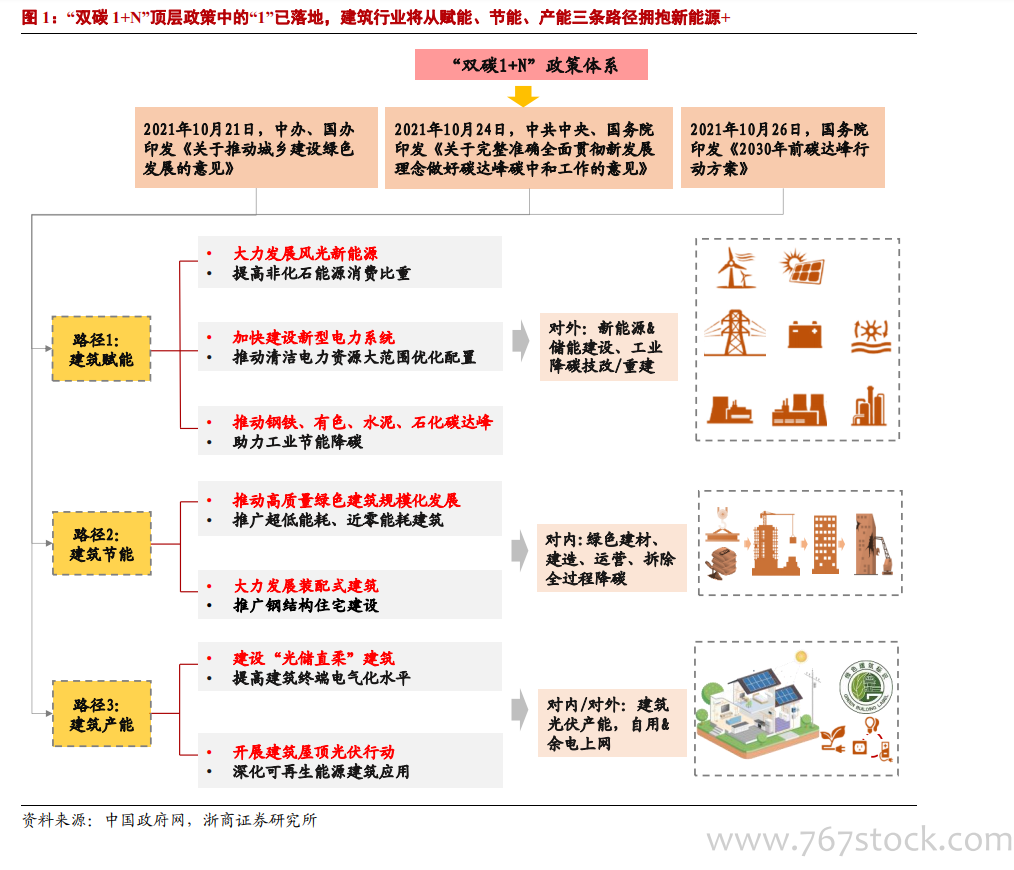 “双碳 1+N”政策体系中的“1”正式发布,要求积极发展非化石能源、推动工业领域绿色低碳发展。《关于完整准确全面贯彻新发展理念做好碳达峰碳中和工作的意见》(以下简称“《双碳工作意见》”),提出调整能源结构、工业领域降碳绿色发展、建筑领域降碳节能进行总体部署。我们认为:新能源&储能大建设、工业降碳改造&减量置换,最终均需以实物量形式落地,建筑工程行业作为项目承揽、工程承建方,将为能源电力、工业各行业门类充分赋能,下属工程咨询、工程承包、工程运维等细分赛道有望充分受益。