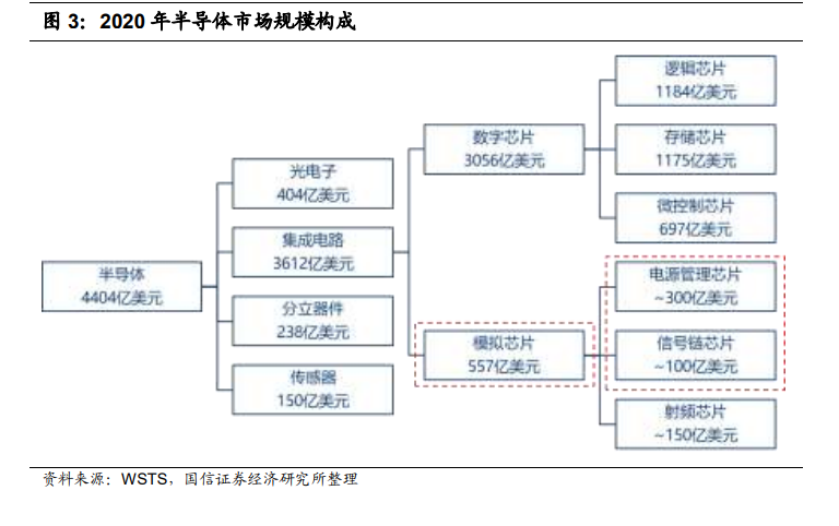 集成电路分为模拟芯片和数字芯片,分别处理模拟信号和数字信号。半导体产品可分为集成电路、光电子、分立器件和传感器四大类;其中集成电路占比超过 80%,从大类上又可分为模拟芯片和数字芯片,分别处理连续的模拟信号和离散的数字信号,近几年模拟芯片销售额占集成电路销售额的比例在 16%左右,2020 年为 15.4%。