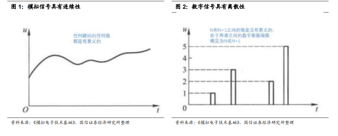 模拟信号具有连续性,数字信号具有离散性。信号是反映消息的物理量,可以从不同角度进行分类。在电子电路中,信号可分为模拟信号和数字信号。模拟信号在时间和数值上均具有连续性,数字信号相反,在时间和数值上均具有离散性。对于模拟信号而言,任何瞬间的任何值都是有意义的;对于数字信号而言,两个整数之间的值是没有意义的,通过设定的阈值将其确定为 N 或 N+1。大多数现实物理量所转换成的电信号是模拟信号,比如温度、压力、声、光等。